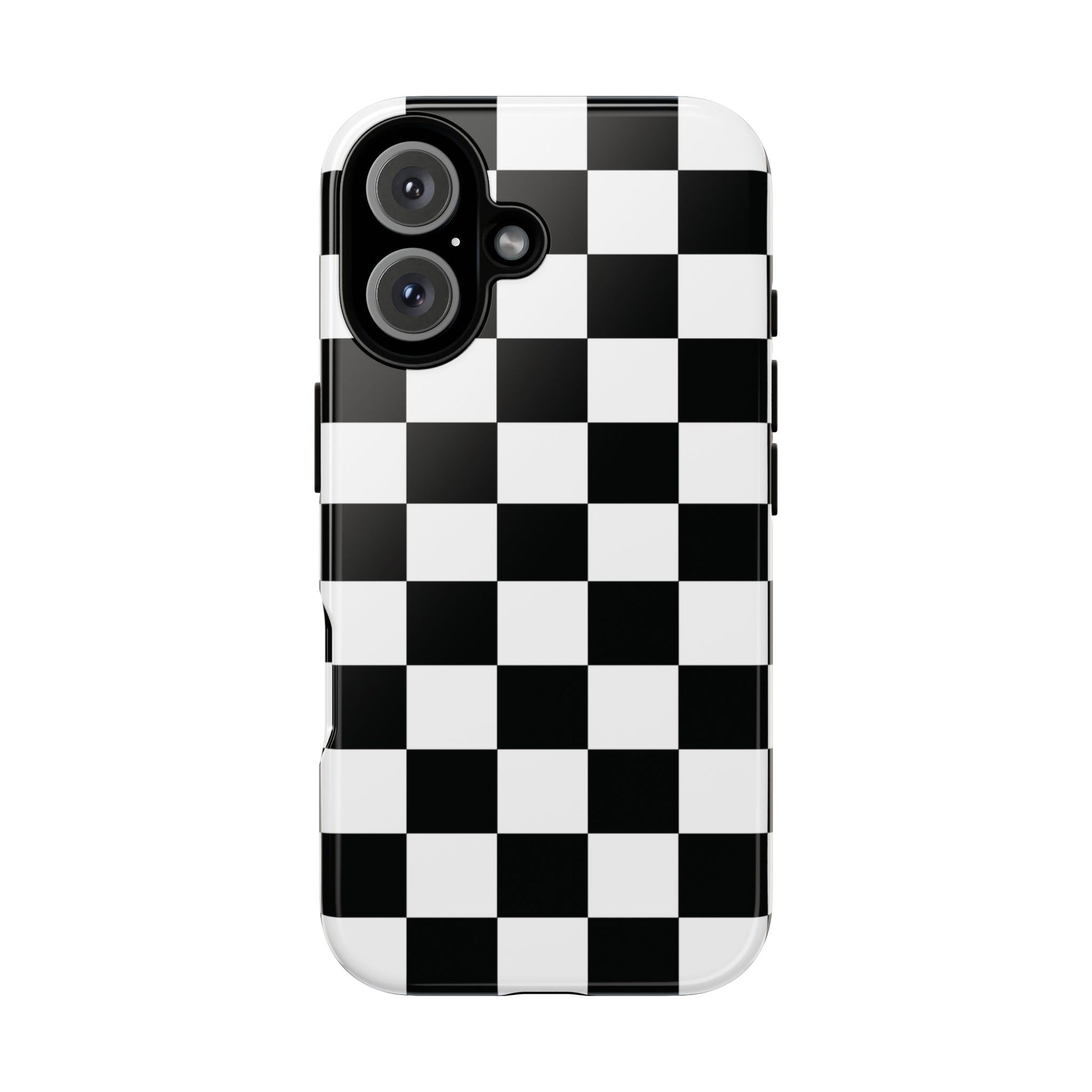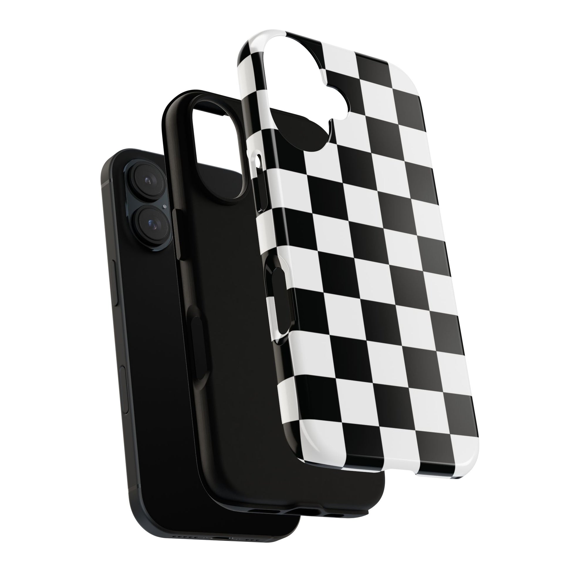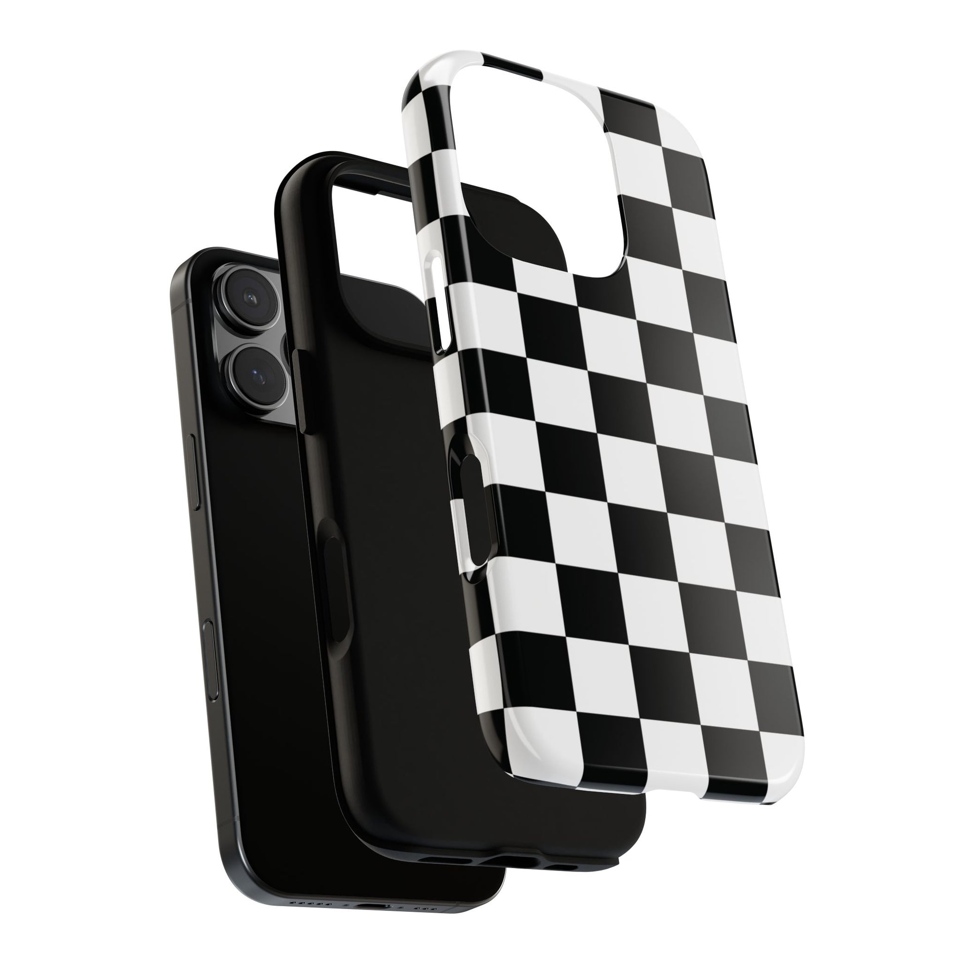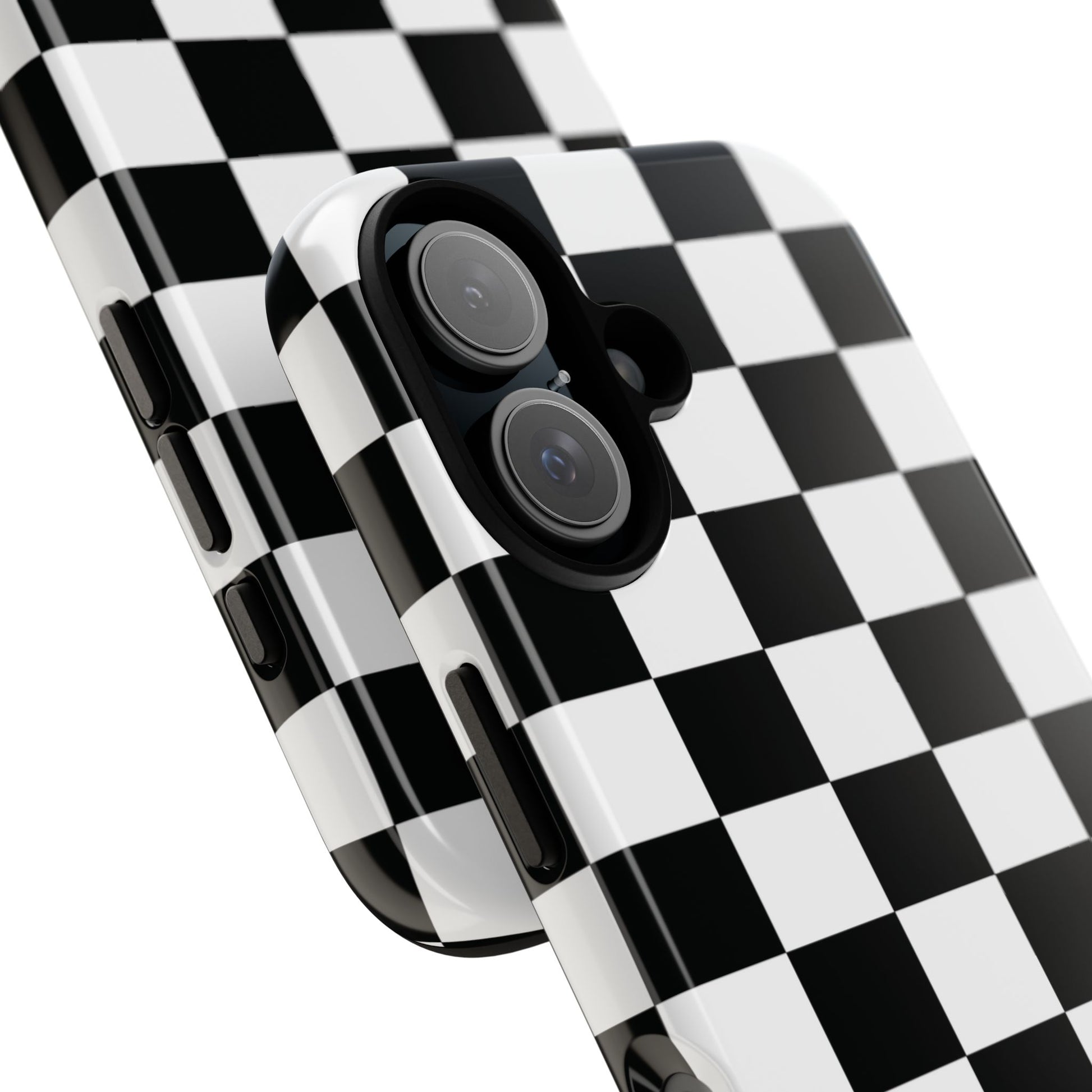 A tough black checkered phone case designed for durability and impact resistance. Perfect for anyone looking to protect their phone in style. Ideal for those tech-savvy individuals who want a sleek and protective accessory for their device. Modern pattern that never gets old.